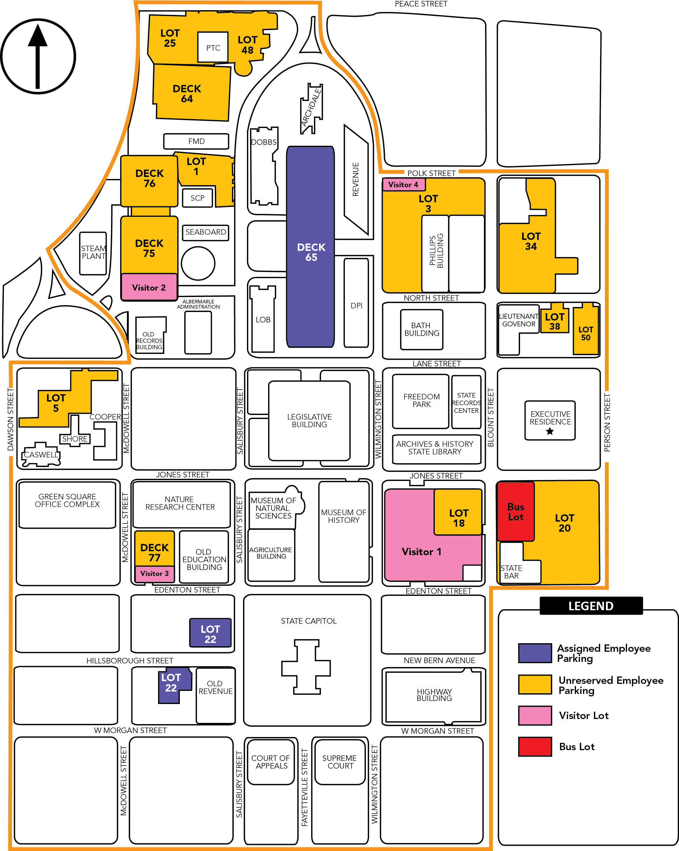 Parking is available in Visitor Lot 1 (Edenton and Wilmington streets), Visitor 2 (Deck 75), Visitor 3 (Deck 77) and Visitor Lot 4 (Lane and Wilmington streets).